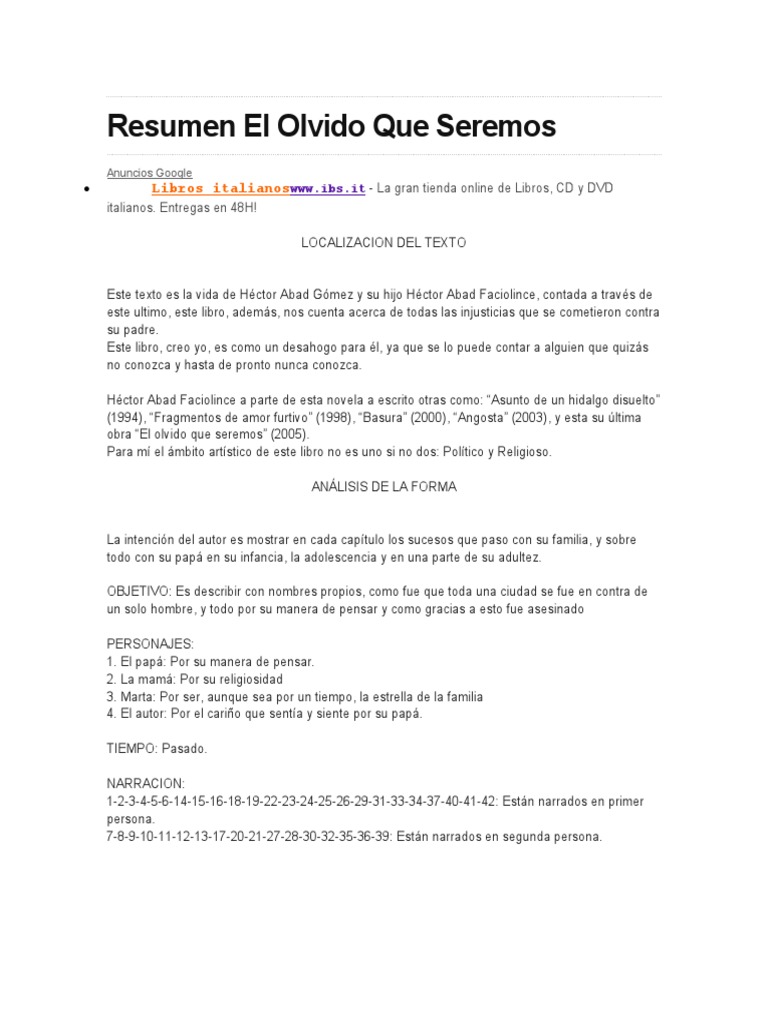 En esta oportunidad, compartiremos con ustedes el contenido de «el olvido que seremos», un trabajo publicado en 2005 cuyo argumento gira en torno «el olvido que seremos» no sólo rescata buenos momentos, sino que también reserva un espacio para los recuerdos más tristes y hasta para criticar. Un relato desgarrador y emocionante sobre la familia, que refleja. Adrian20781 está esperando tu ayuda. Read 1,147 reviews from the world's largest community for readers. 2 introduccion con este corto resumen de la obra literaria el olvido que seremos de héctor abad facio lince es mostrar el principio y nudo. Resumen del libro el olvido que seremos de hector abad by jennifer6daniela6ura. The story about a colombian writer's father. Publicada en noviembre de 2005 por la editorial planeta, para finales de ese año se habÃa reimpreso ya en tres ocasiones y en los años sucesivos alcanzó más de cuarenta ediciones y más de 200 mil. This opens in a new window. Narra de manera Ãntima la historia de un hombre bueno, el médico colombiano héctor abad gómez, carismático lÃder social y hombre de familia. La memoria y el olvido. Javier cámara, patricia tamayo, juan pablo urrego and others. Libro gratis es una de las tiendas en lÃnea favoritas para comprar el olvido que seremos resumen por capitulo a precios mucho más bajos de lo que. Está lleno de sonrisas y canta el placer de vivir, pero muestra.